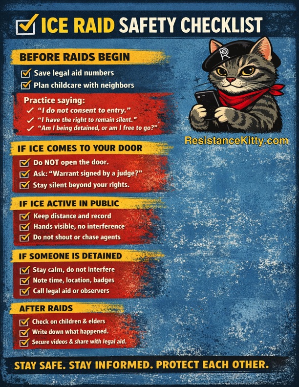Fear is the weapon. Preparation is the shield. You don’t need to be fearless — you need to be informed, connected, and calm. Raids rely on confusion. Communities survive through knowledge, solidarity, and care. Protect each other. Stay lawful. Stay human.