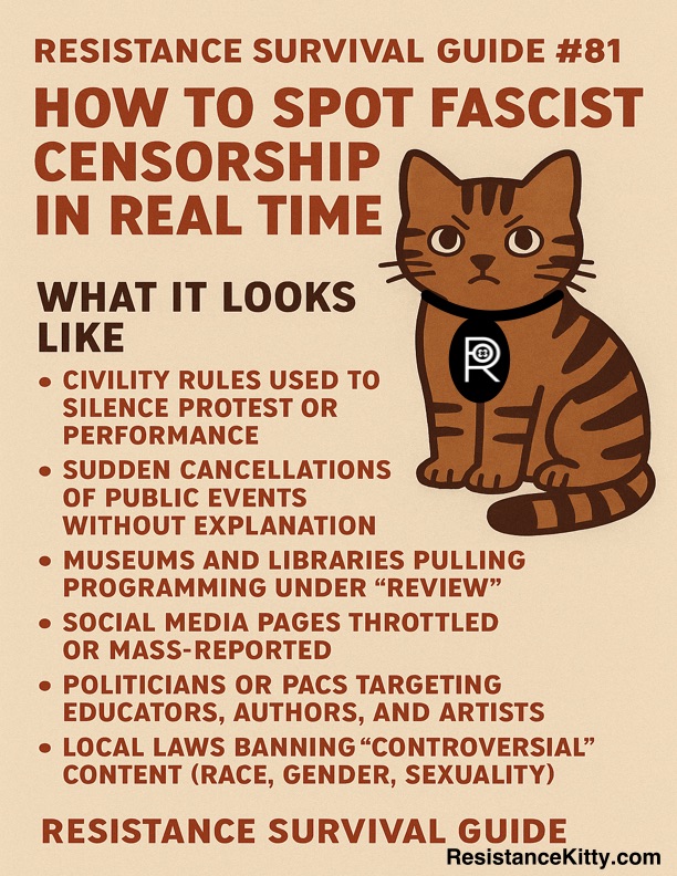 Censorship isnât always a bonfire of booksâitâs often quieter, sneakier, and dressed up in bureaucratic nonsense. This guide teaches you how to recognize the signs of state-sponsored censorship, from canceled art exhibits to banned books to silenced social media voices. Whether itâs your local library, your school board, or a national museumâwhen fascists fear the truth, they come for the storytellers.