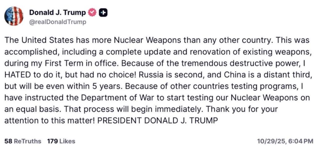 - And then, at 2 a.m., Donald J. Trump logged on and dropped a deranged tweet suggesting the U.S. “might need to restart nuclear testing to stay strong.” Because nothing says “stable leadership” like casually threatening global fallout between midnight snack breaks.