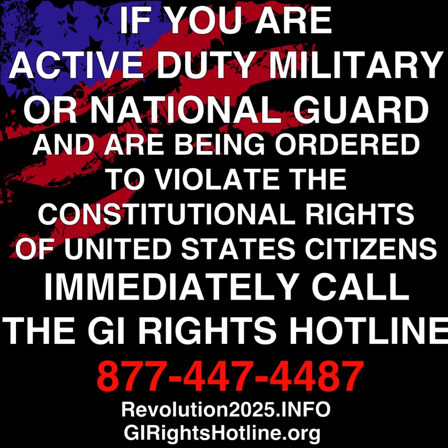 GI Hotline is an independent resource that helps service members understand their rights, get legal help, and resist unlawful orders and abuse inside the chain of command. They provide confidential support, know military law better than half the people barking orders, and stand firmly on the side of conscience over authoritarian loyalty.