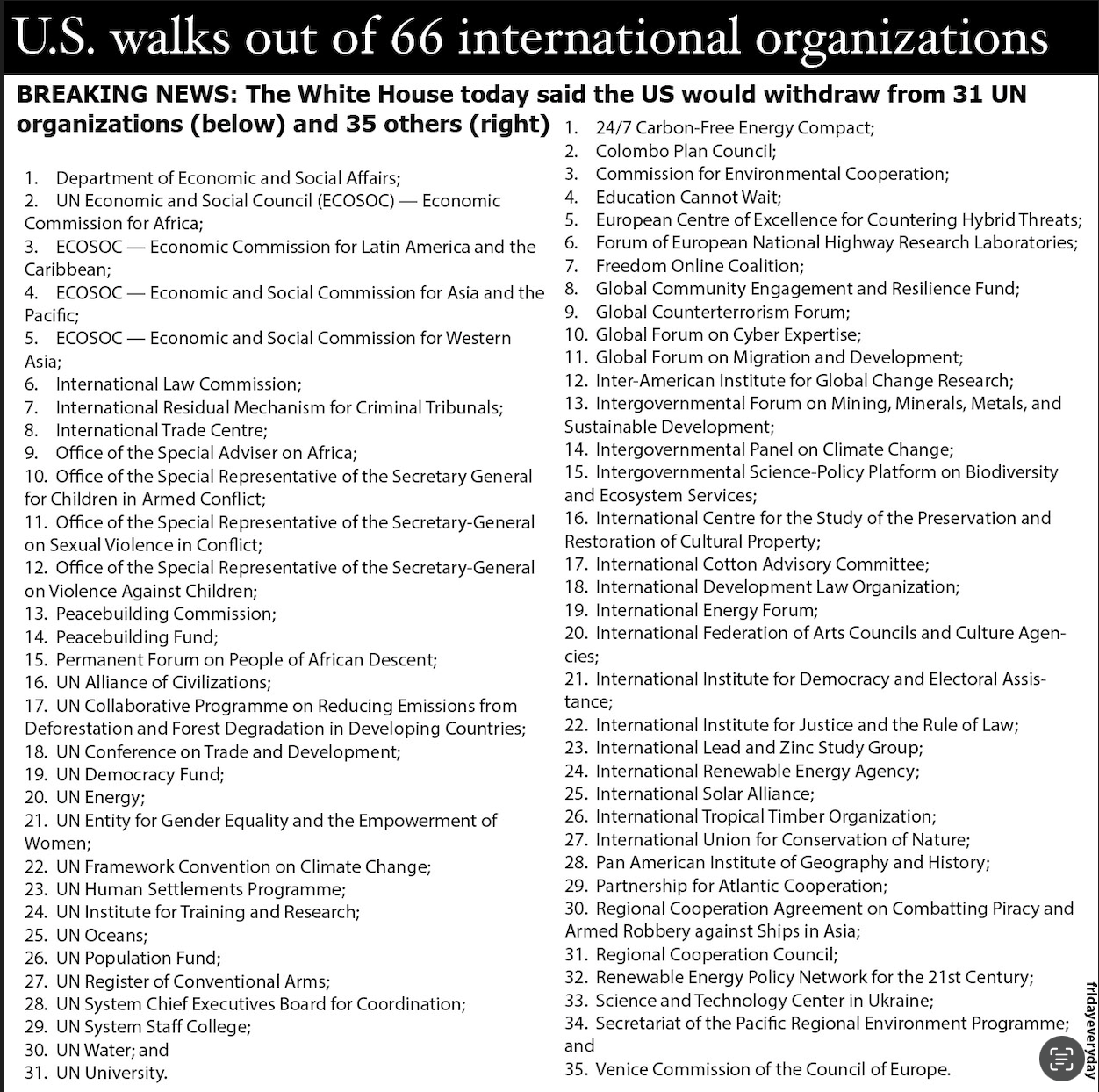 The White House has announced a sweeping withdrawal of the United States from 66 international organizations, conventions, and treaties, including 35 non-UN bodies and 31 United Nations entities that the administration says are “contrary to U.S. interests,” covering climate, global governance, economics, and more. The presidential memorandum orders federal agencies to cease participation and funding for these groups — part of a broader push to “restore American sovereignty” and redirect taxpayer dollars. Critics warn this move not only undercuts global cooperation on issues from climate change to human rights but also diminishes U.S. influence on the world stage.