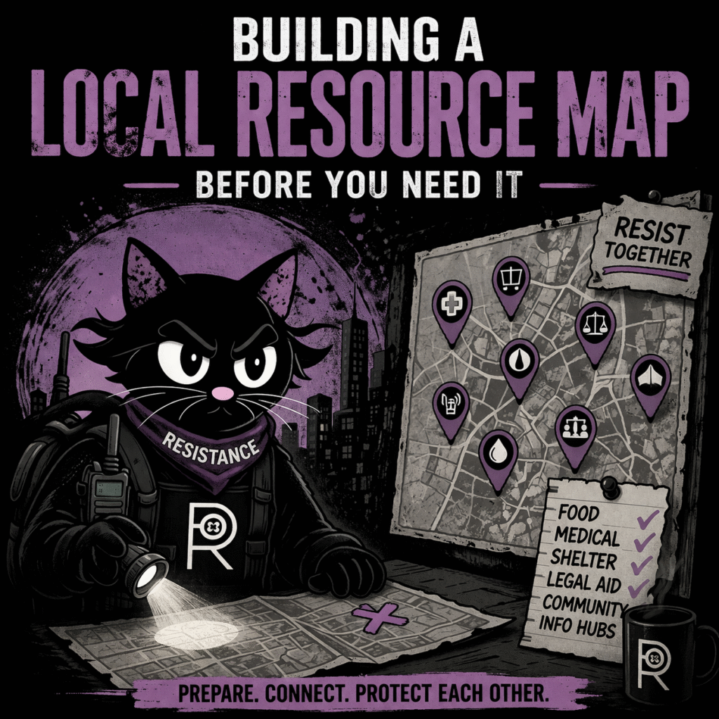 A local resource map is a curated, organized list of real world support systems in your area, built before you need them. It includes essentials like hospitals, urgent care centers, pharmacies, food banks, shelters, legal aid, and community organizations. It also includes nontraditional but critical resources like mutual aid groups, independent journalists, and local organizers.